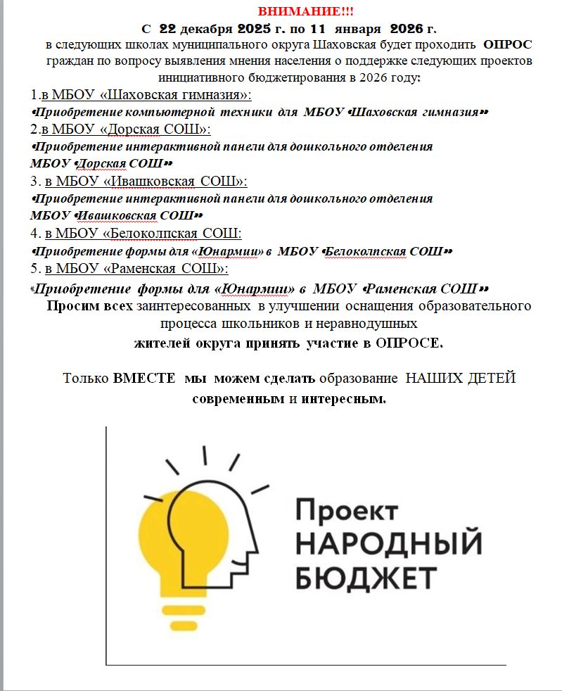 В конце 2025 года в рамках реализации проектов инициативного бюджетирования в МКОУ «Шаховская школа-интернат», МБОУ «Дубранивская СОШ» и филиале «Муриковская СОШ» МБОУ «Шаховская СОШ № 1» при содействии депутата Московской областной Думы фракции Единая Россия Вшивцева Владимира Сергеевича и депутата Московской областной Думы фракции КПРФ Черемисова Константина Николаевича, была осуществлена поставка необходимого оборудования:
