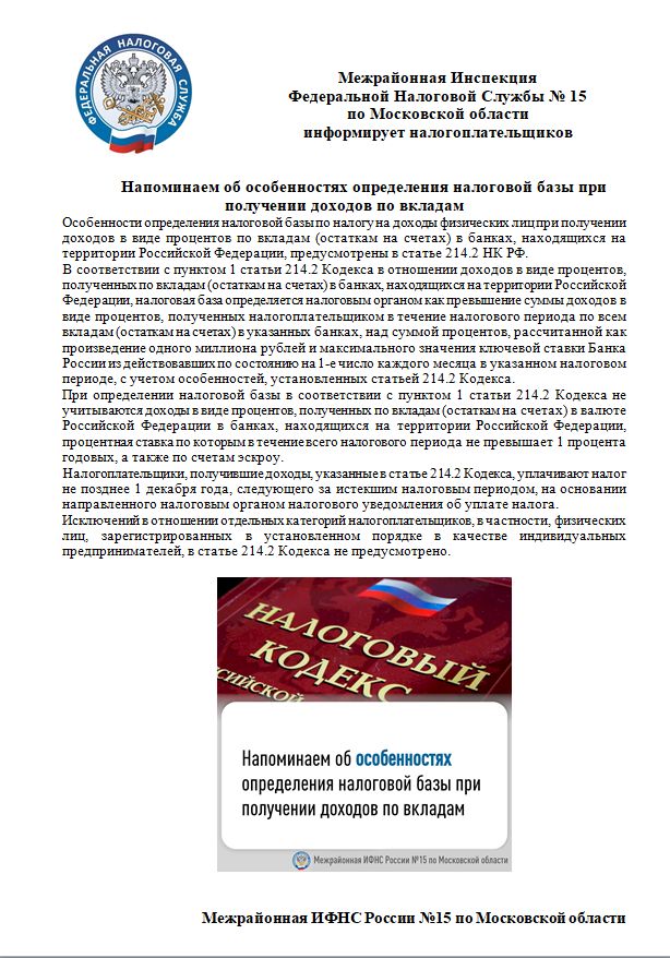 Межрайонная Инспекция Федеральной Налоговой Службы России №15 по Московской области информирует
