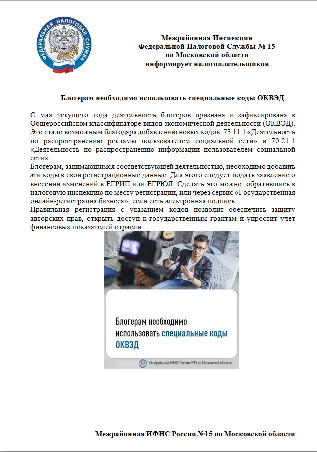 Межрайонная Инспекция Федеральной Налоговой Службы России №15 по Московской области информирует