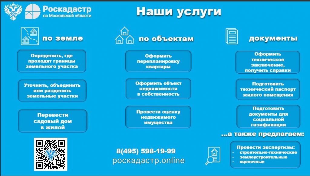 Обо всех услугах, оказываемых филиалом ППК «Роскадастр» по Московской области, вы можете узнать, перейдя по ссылке: www.kadastr.ru.