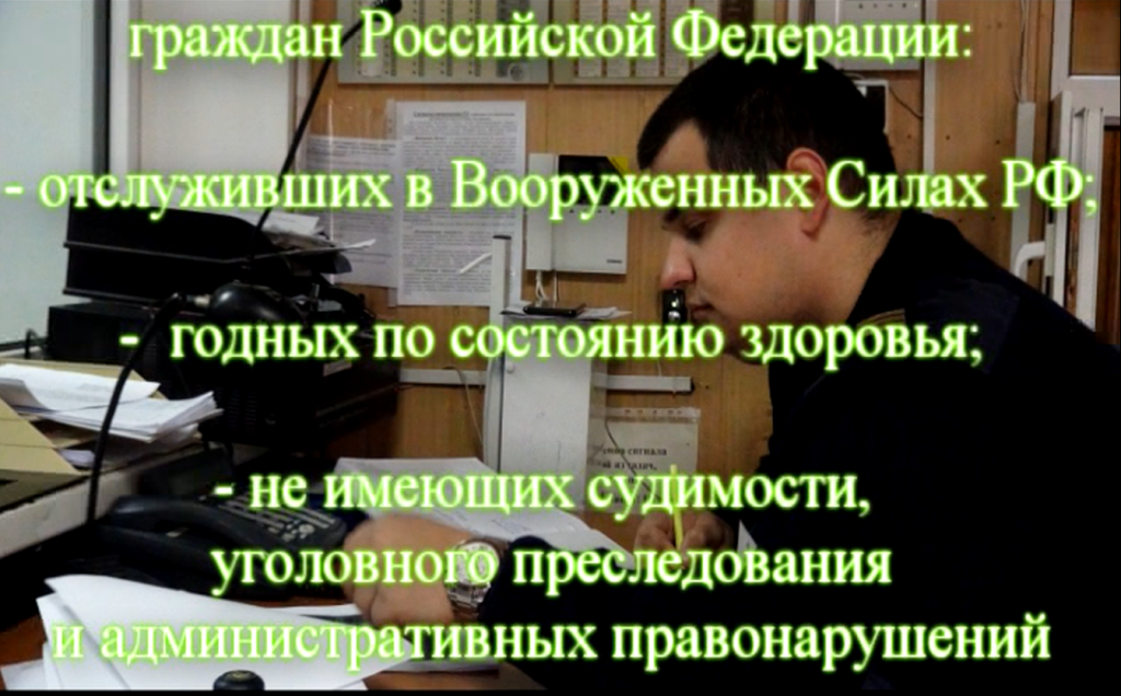 - граждан Российской Федерации, отслуживших в Вооруженных Силах РФ, годных по состоянию здоровья, не имеющих судимости, административных правонарушений, уголовного преследования.