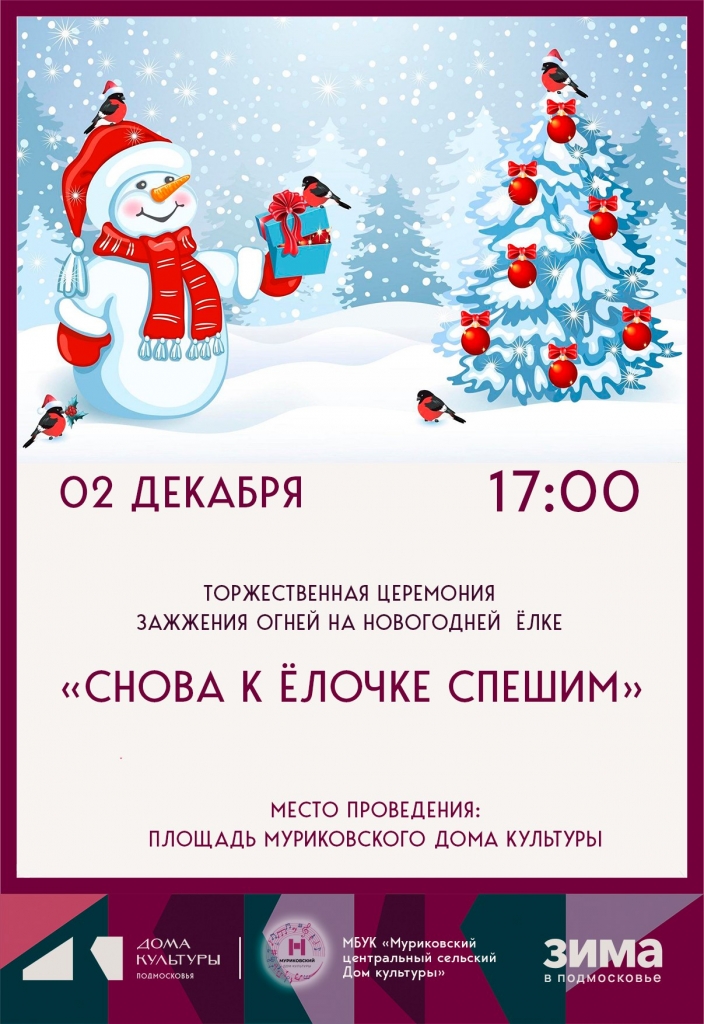 2 декабря состоится церемония зажжения огней на Новогодней ёлке на площади Муриковского Дома культуры.